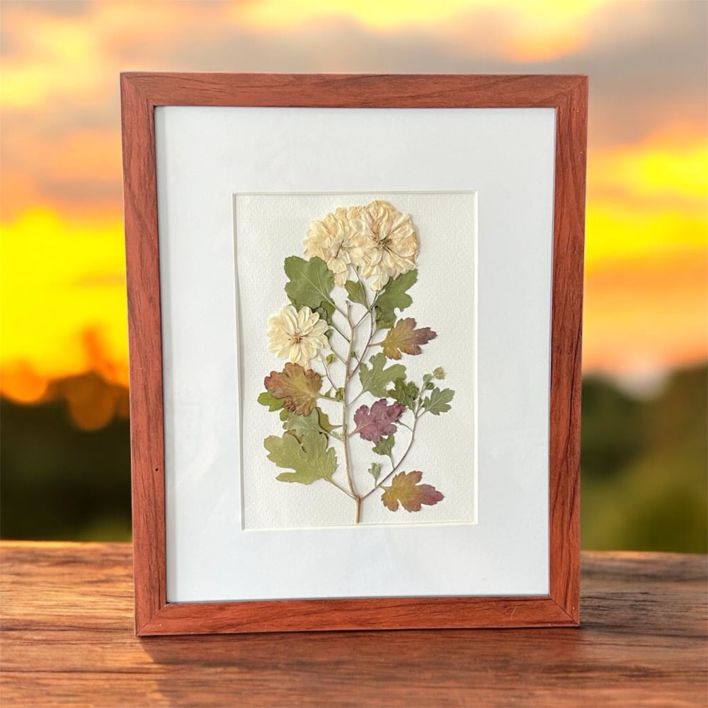 These beautiful Chrysanthemum wildflowers were personally grown and harvested from my garden. They have been carefully hand-pressed, dried and framed in a 8" X 10" red wood-look picture frame with glass. This unique piece of artwork forever captures the beauty of these wildflowers and will provide a gorgeous display for that perfect spot on a wall or desk within your home or office.
