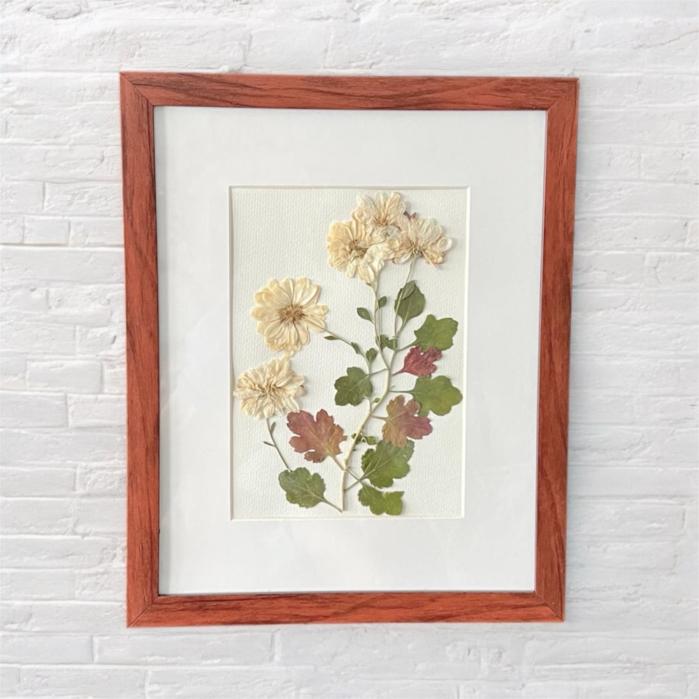 These beautiful Chrysanthemum wildflowers were personally grown and harvested from my garden. They have been carefully hand-pressed, dried and framed in a 8" X 10" red wood-look picture frame with glass. This unique piece of artwork forever captures the beauty of these wildflowers and will provide a gorgeous display for that perfect spot on a wall or desk within your home or office.