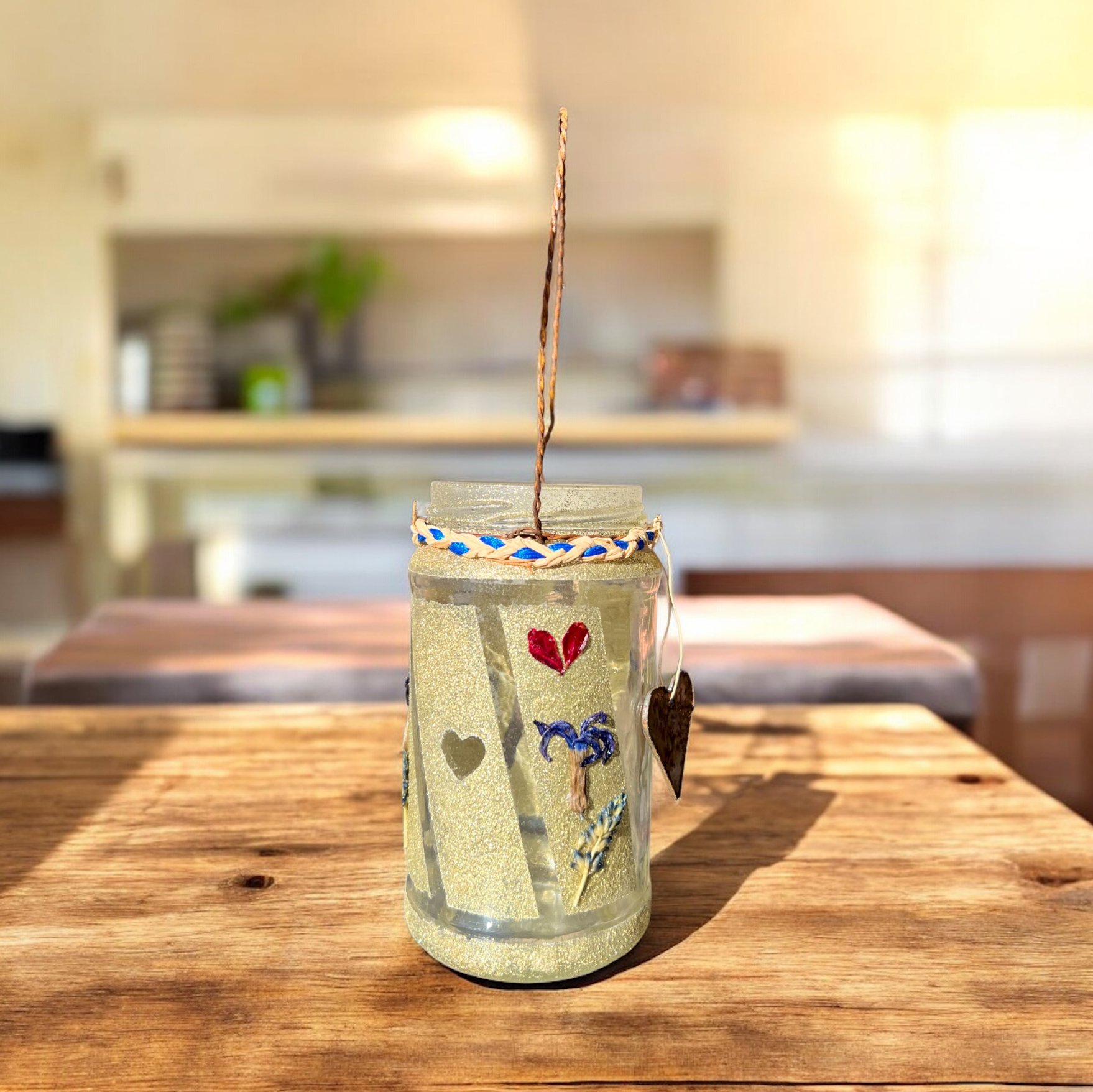 Bring a touch of rustic charm into your home with this enchanting heart wildflower jar candle holder. Handcrafted with beautiful dried blooms of Hyacinths, Lavender, and Barberry leaves from my gardens, this candle holder is adorned with a rustic wire handle, a weathered metal heart charm, a braided raffia ribbon tassel, and a touch of shimmery gold glitter on the glass to give it a little bit of pretty sparkle.